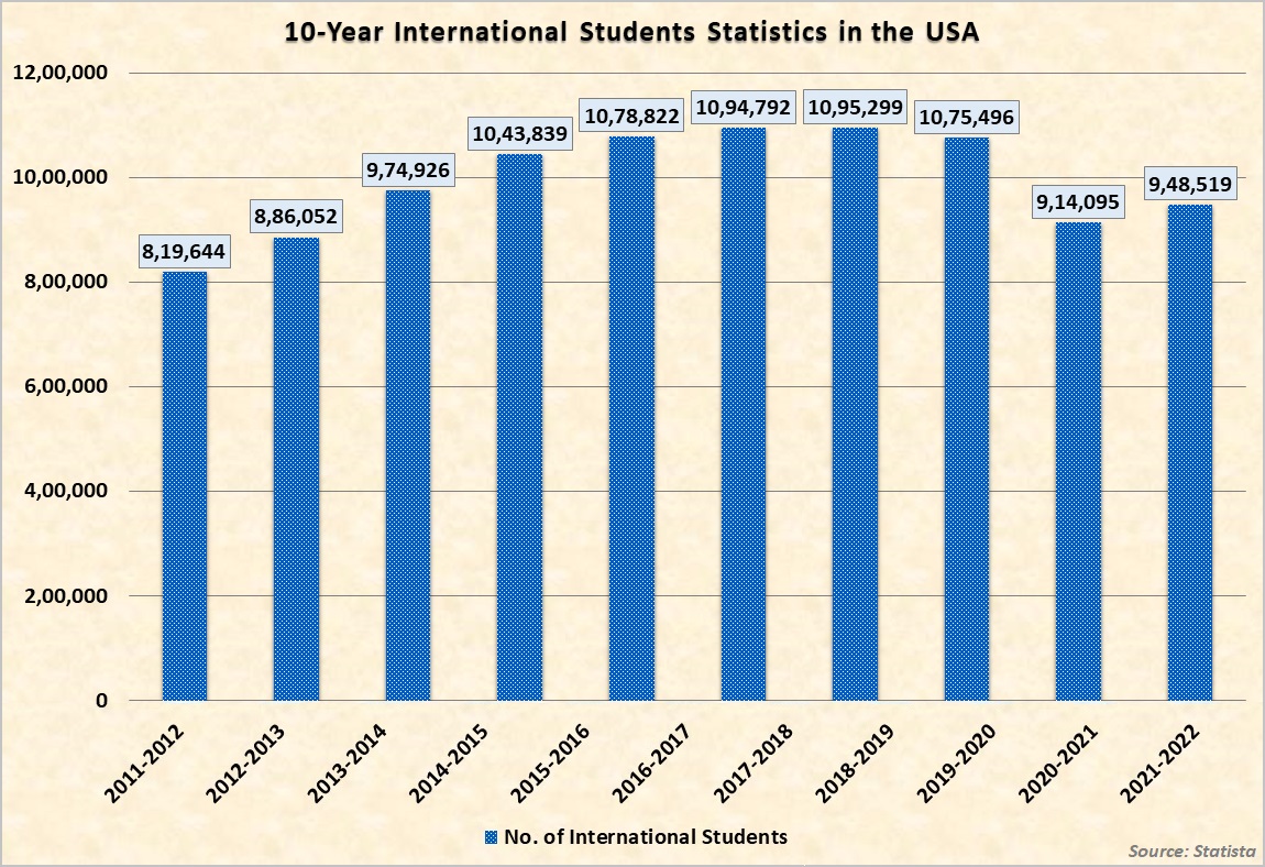 More than 1,000,000 international students study at US colleges and universities each year, making it the largest country in the world with regard to international students. More than 5% of all students enrolled in higher education in the USA are foreign students. International education in the country has evolved greatly since the mid-1950s when there were only 35,000 international students since then the number is accentuating. The following is a graphical representation of the number of international students enrolled at US universities for a decade i.e., from 2011 to 2022: